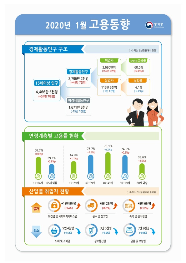 통계청이 오늘 12일 발표한 '2020년 1월 고용동향'에 따르면 지난달 취업자는 2680만명으로, 전년동월대비 56만8000명 증가, 2.2% 상승했다.