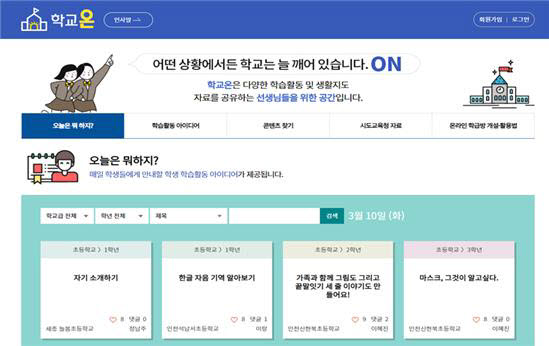교육부는 11일 학생들의 온라인 학습 지원을 위해 온라인 학습 통합 지원 사이트 ‘학교온(On)’을 열었다. 학교온은 온라인 학습자료 공유를 위해 전국 교사들이 직접 만든 사이트다. 사이트 내 ‘오늘은 뭐하지’ 섹션에선 교사들이 자발적으로 제작한 일일 학습활동 아이디어가 초·중·고 학교 및 학년별로 제공되고 있다.