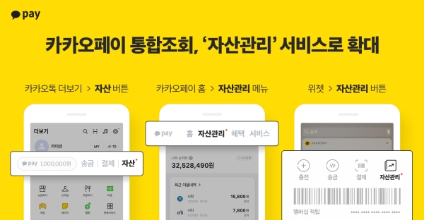 [디지털투데이 정유림 기자] 카카오페이(대표 류영준)가 이용자의 금융 자산을 한 눈에 볼 수 있는 ‘통합조회’를 자산 및 지출 분석까지 가능한 ‘자산관리’ 서비스로 확대한다고 25일 밝혔다.