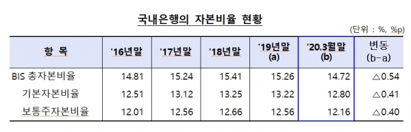 금감원 관계자는 "1분기에 코로나19 사태를 극복하고자 은행들이 대출에 적극 나서고, 환율 상승으로 장외파생상품 관련 위험가중 자산이 증가한 영향이 있었다"며 "코로나19에 따른 대출 증가세가 이어지고 있으나 대부분의 은행과 지주사가 규제 비율 대비 자본 여력을 갖고 있다"고 설명했다.