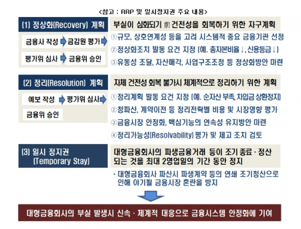 만약 정리절차가 시작되면 금융계약의 조기 종결권을 최대 2영업일간 정지시켜 금융시장의 혼란을 막는다. 이 제도가 도입될 경우 금융위는 대형 금융회사에서 부실이 발생하더라도 체계적인 대응을 통해 금융시스템을 안정시킬 수 있을 것으로 내다봤다.