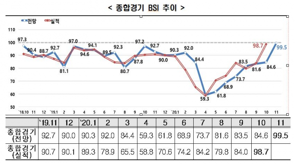 한국경제연구원(한경연)은 기업경기실사지수(Business Survey Index·BSI) 조사 결과 11월 전망치가 10월(84.6) 대비 14.9포인트(p) 상승한 99.5를 기록했다고 27일 밝혔다.