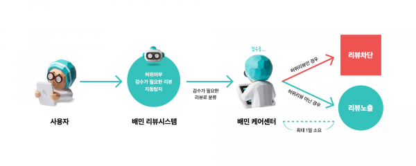 허위 및 조작이 의심되는 리뷰는 내용과 별점이 모두 바로 등록되지 않고 일시적으로 노출이 제한된다. 허위 의심 리뷰는 전담 인력이 추가로 검수한 후 24시간 이내에 최종 공개 또는 차단을 결정한다.