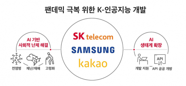3사가 내년 상반기에 공개할 첫 합작품은 ‘팬데믹 극복 AI’다. 이 AI는 현재 위치 주변 코로나 위험 상황을 실시간 파악하고 위험도를 분석해 이용자들에게 사회적 거리두기를 권고하거나 우회 경로 등을 안내한다. 향후 태풍, 폭우 등 재난 재해 상황에도 적용될 수 있다.