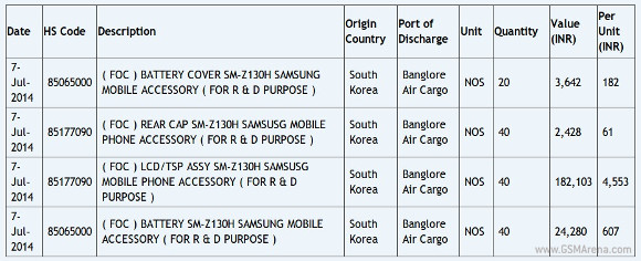 15일 삼모바일 등의 다수의 IT매체는 삼성 타이젠 스마트폰 '삼성Z' 부품 발송장을 공개했다. 발송장을 살펴보면 삼성Z의 모델명은 SM-Z130H로 표기되어 있다. 삼성은 배터리, 리어캡, LCD 디스플레이 등의 부품을 인도로 보냈다.