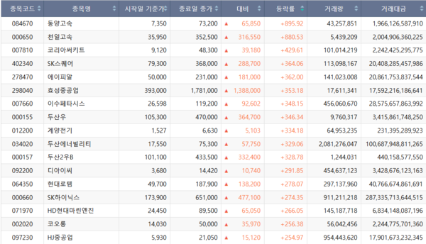 KOSDAQ市场方面,半导体设备企业WONIK Holdings以1809.80%的年内涨幅位居首位。该股由年初的2550韩元升至4.87万韩元,成为今年涨幅最为突出的个股之一。