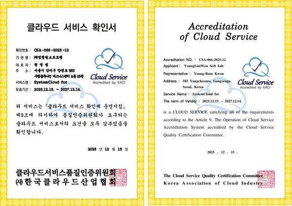 企业解决方案提供商Younglimwon Softlab 6日表示,旗下混合云ERP服务“SystemCloud for”已通过韩国云产业协会(KACI)云服务确认制。