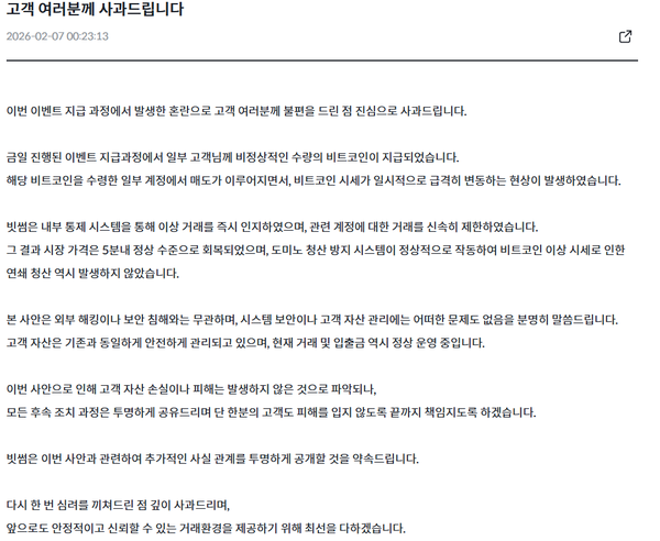 Bithumb就2月6日发生的比特币(BTC)误发事件发布正式致歉声明,并强调此次事故并非黑客攻击,而是内部派奖流程出现错误。目前,市场已基本恢复稳定。