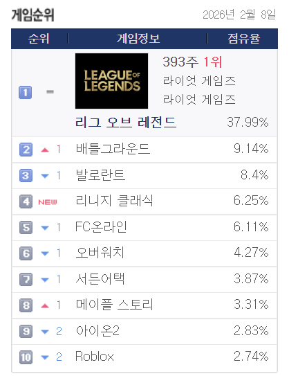网吧数据统计网站GameTricks于9日公布的数据显示,截至2月8日,《Lineage Classic》网吧占有率为6.25%,排名高于《FC Online》《Overwatch》《MapleStory》,也超过了NCSoft于去年11月推出的《Aion2》。