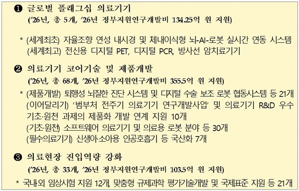 在“医疗器械核心技术及产品开发”方向,项目拟向68个课题提供355.5亿韩元支持,涵盖退行性脑疾病诊断系统、数字化手术辅助机器人协作系统等,并推进软件类医疗器械、医疗机器人以及新生儿和儿童呼吸机等必需医疗器械的国产化。