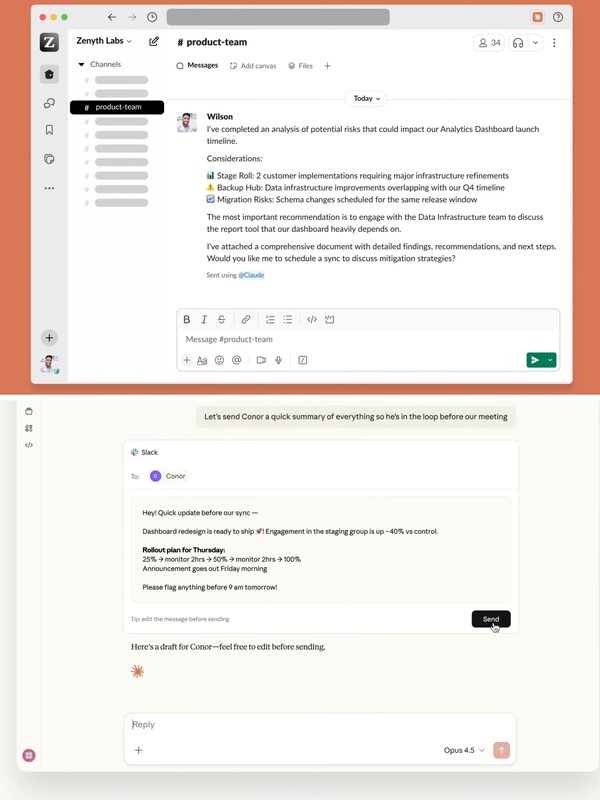 接入完成后,用户可直接在Claude中检索Slack对话内容,并据此生成会议议程或方案文档,随后自动分享至Slack频道。Salesforce举例称,用户只需在Claude中输入“汇总上周市场团队在Slack中的讨论,并分享至该频道”,即可完成相关操作。