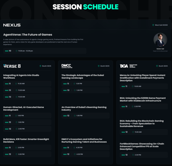 GDC 2026将于当地时间3月11日至13日在美国旧金山莫斯康中心举行。届时,Nexthrus将在展会现场安排合作伙伴分享环节,参与方包括区块链游戏联盟(BGA)、迪拜综合商品中心(DMCC)和Verse8。