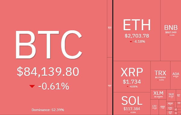 Coin360数据显示,1月31日9时30分,比特币(BTC)报84139美元,较前一日下跌0.61%。在经历快速下挫后,市场抛压较此前有所缓和,但短线方向仍不清晰,比特币价格继续在8.4万美元附近反复震荡。