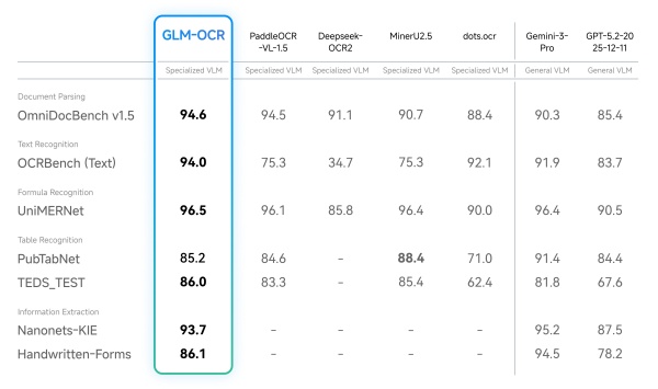Z.ai还在社交平台发文称:“Introducing GLM-OCR: SOTA performance, optimized for complex document understanding. With only 0.9B parameters, GLM-OCR delivers state-of-the-art results across major document understanding benchmarks, including formula recognition, table recognition, and information extraction… pic.twitter.com/2c6iSsaXYs”