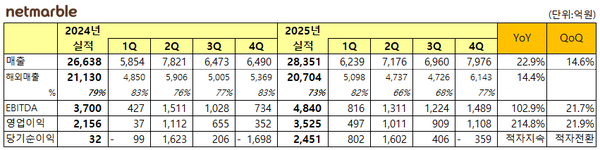 分季度看,Netmarble第四季度业绩同样刷新单季纪录。公司当季营收7976亿韩元,同比增长22.9%;营业利润1108亿韩元,同比增长214.8%。EBITDA为1489亿韩元,同比增长102.9%;EBITDA利润率为18.7%。公司表示,这主要受益于海外子公司季节性内容更新,以及现有产品在海外市场拓展取得成效。不过,受《King Arthur: Legend Rise》停运并计提商誉等无形资产减值影响,第四季度净亏损359亿韩元。