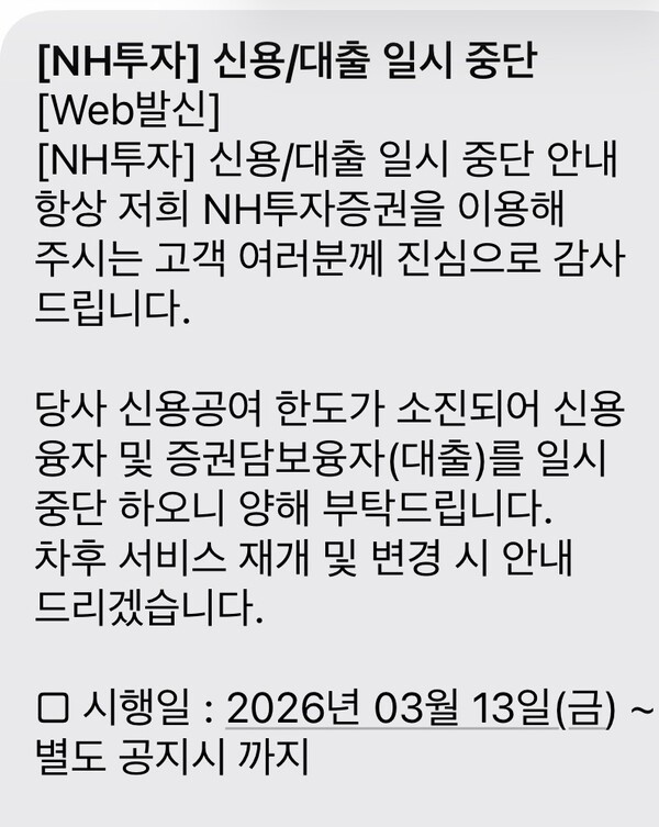 NH Investment & Securities12日表示,由于信用供给额度已用尽,公司将暂时停止新增融资买入。该措施自12日起执行,恢复时间将另行通知;融券卖出业务则可继续进行。