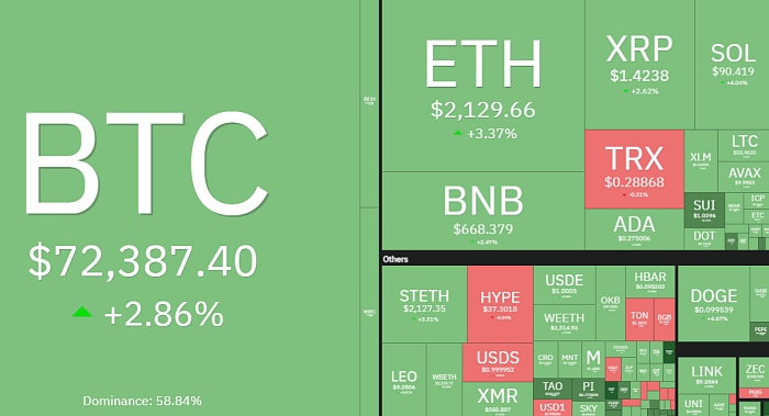 Coin360数据显示,截至13日21时,比特币(BTC)报72387美元(约1亿560万韩元),较前一交易日上涨2.86%,市值占比为58.84%。