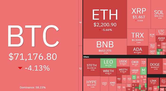 比特币(BTC)回落至71176美元,日内跌幅为4.13%。以太坊(ETH)跌至2200美元,跌幅5.66%;XRP报1.46美元,下跌3.51%;Solana(SOL)报90.34美元,下跌4.75%;BNB报652美元,下跌2.75%。比特币市值占比为58.23%。