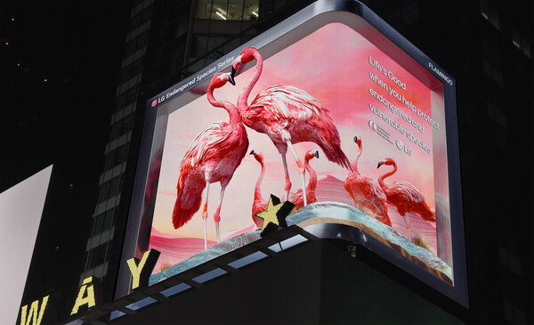 LG Electronics持续通过纽约时报广场大屏开展濒危物种保护宣传。公司近日发布“与LG一起守护濒危动物”系列第9支宣传片,主角为火烈鸟。