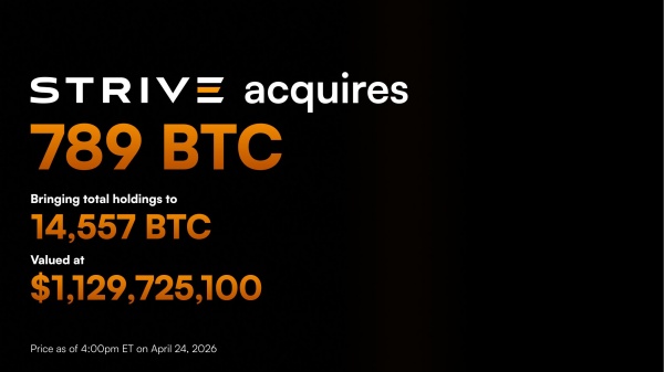 Strive首席执行官Matt Cole当天披露了这笔交易。交易完成后,公司持有的比特币总量增至14557枚,按当前市价计算约值13亿美元。