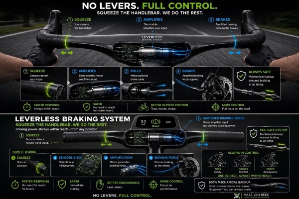 Maas van Beek 认为,自行车的传统刹车结构在过去一个多世纪中几乎没有发生根本性变化。与持续迭代的其他部件相比,制动操作仍以刹把为中心。他将这一设计称为“对延续百余年的刹把概念发起挑战”。