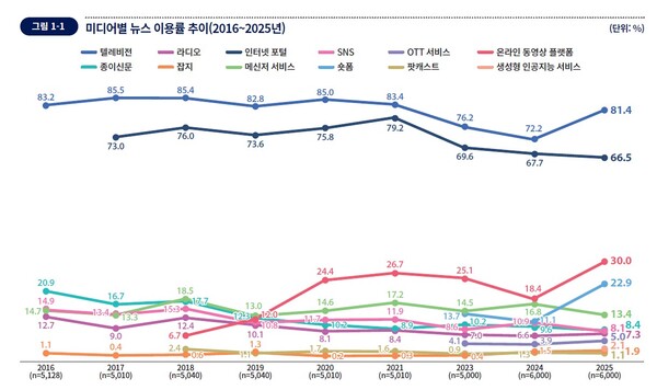 According to the Korea Press Foundation's "2025 Media Audience Survey" report released on Jan. 5, a survey of 6,000 adults aged 19 and older conducted by Korea Gallup from July to September last year found that 66.5 percent said they used internet portal news over the past week.