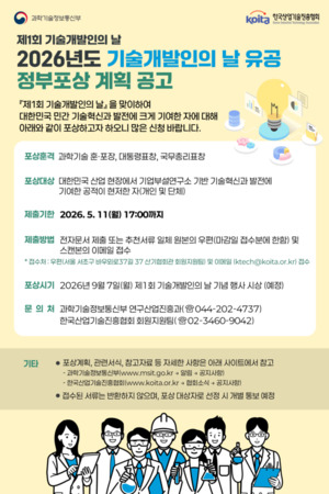 科学技術情報通信部は16日、「第1回 技術開発人の日」に合わせた2026年度の政府表彰の公募を始めた。民間の技術革新を支えた研究者や団体を顕彰し、推薦の受け付けは5月11日まで。
