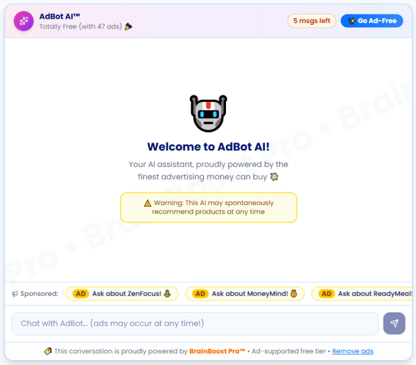 デモ画面の中央には、「AdBot AI」と名付けたチャットボットを配置した。広告枠は上部に2つ、右側に2つ、下部に1つ表示される。チャットボット名の下には「完全無料(広告47個を含む)」と表示し、画面上部には「残り広告5個」といった案内も出る。