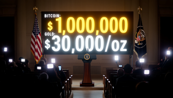同氏が示したシナリオでは、政府がビットコインと金の価値を公式に引き上げる。具体的には、ビットコインを1BTC=100万ドル(約1億5000万円)、金を1オンス=3万ドル(約450万円)とし、その水準でドルをビットコインや金に交換できるようにする構想だ。