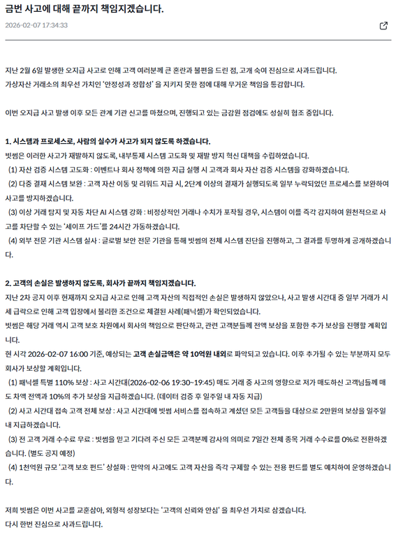 Bithumbは「2月7日午後4時時点で把握している顧客の損失額は10億ウォン(約1億1000万円)程度」とした上で、「その後に発生し得る追加分も含め、全て会社が責任を持って補償する」と強調した。