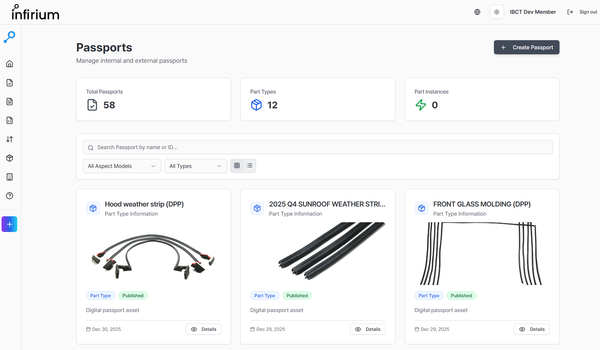 PoCに使用したInpheriumは、Catena-X認証を取得したプラットフォーム。グローバルサプライチェーンとの接続に加え、デジタル製品パスポート(DPP)やDBPの発行、EU規制への対応を支援する。