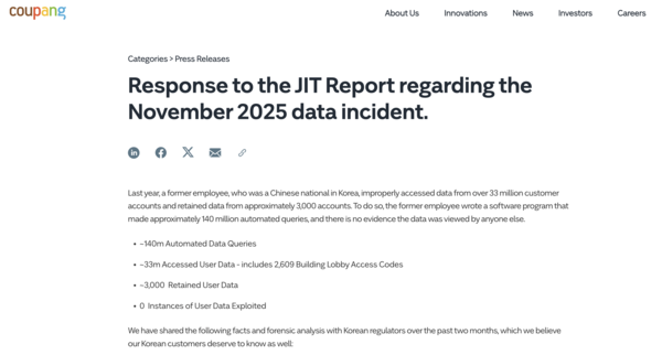 Coupangは2月10日、個人情報流出の規模を巡る官民合同調査団の発表を受け、元従業員による不適切なアクセスがあったことは認めた一方、実際に保存されたデータは限定的で、外部流出や二次被害の証拠は確認されていないとの見解を示した。あわせて、報告書に記載された共用玄関コードの「5万件」という数値について、「実際のアクセスは2609件に限られる」と反論した。