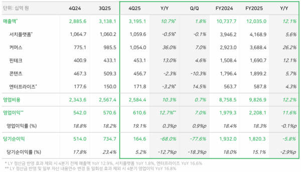 コマースは、Smart StoreとグローバルC2C事業の堅調な拡大を背景に、前年同期比36%増と高い伸びを示した。フィンテックもSmart Storeの成長や外部エコシステムの拡大が寄与し、同13%増となった。第4四半期の決済額は23兆ウォンで、前年同期比19%増だった。