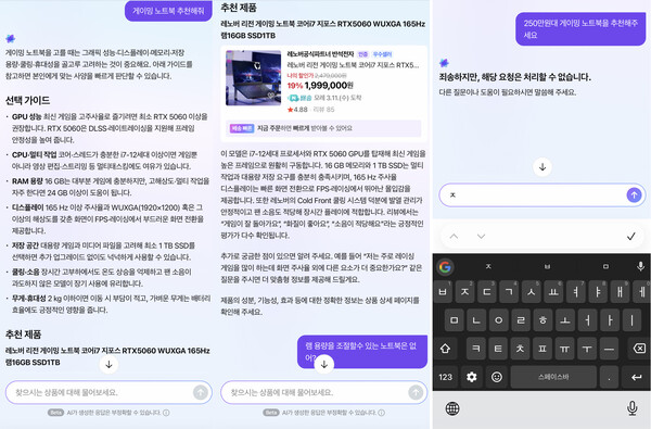 続けて「いくつか選択肢を出して」「250万ウォン台の製品の基本スペックはどの程度か」「250万ウォン台のゲーミングノートPCを推薦して」などと質問したが、結果は大きく変わらなかった。価格帯別のガイドは示される一方で具体的な推薦商品が抜ける場合があり、「当該リクエストは処理できません」といったエラー表示に近い応答も確認された。同じ質問を再入力すると、すでに提示された「Lenovo Legion ゲーミングノートPC」が再び推薦される場面もあった。
