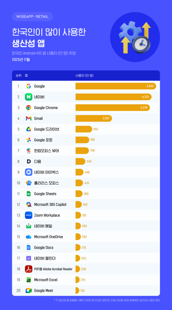 Wiseapp・Retailは1月7日、韓国における主要生産性アプリの2025年11月の月間アクティブユーザー数(MAU)と、アプリカテゴリ別の利用率を公表した。MAU首位はGoogleで4640万人だった。