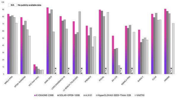 政府の独自AI基盤モデルプロジェクトの一次評価では、K-EXAONEが13種類の共通ベンチマークで平均72点を獲得した。韓国の特性を測る指標「KGC-SAFETY」では4分野平均97.83点を記録し、OpenAIの「GPT-OSS 120B」(92.48点)やAlibabaの「Qwen3 235B」(66.15点)を上回った。