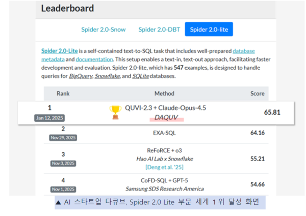 Daqubeは1月20日、Text-to-SQLの性能評価「Spider 2.0」のLite部門で首位になったと発表した。スコアは65.81点で、Snowflakeなどを上回った。