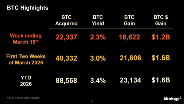 Strategyによると、3月15日終了週のBTC Yieldは2.3%。年初来では3.4%となり、累計のBTC Gainは2万3134BTCに達した。セイラー氏は、ドル建て会計では企業の実態が正しく表れないと主張している。一方、市場では、これらはあくまでビットコイン保有量の増加を示す非GAAPベースの指標にすぎないとの受け止めもある。