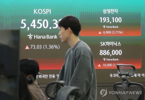 韓国株式市場で6日、主要株価指数のKOSPIは機関投資家の買い越しが相場を支え、前営業日比1.36%高の5450.33で取引を終えた。終値で5450台を回復した。一方、KOSDAQは1.54%安の1047.37となった。