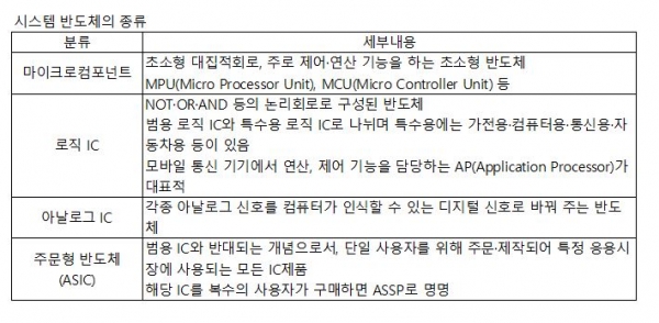 시스템 반도체는 ▲마이크로컴포넌트 ▲로직 IC ▲아날로그 IC ▲주문형반도체(ASIC) 등으로 나뉜다. 마이크로컴포넌트는 대부분 알고있는 CPU와 초소형 제품에 들어가는 MPU, MCU가 포함된다. 로직 IC는 논리회로로 구성된 반도체를 말한다. 모바일 AP가 대표적이다.