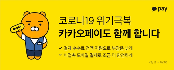 이진 카카오페이 사업 총괄 부사장(COO)은 “코로나19 확산으로 경제적 타격을 입고 있는 가맹점주들에게 조금이라도 힘이 되기를 바라며 이번 방안을 마련하게 됐다”며 “위기를 잘 이겨낼 수 있도록 카카오페이도 최선을 다하겠다”고 밝혔다.