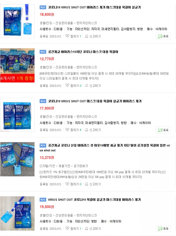 앞서 2015년 중동호흡기증후군(MERS·메르스) 사태 당시 일본에서 처음 판매될 때도 일본 소비자청은 이런 류의 제품 효과가 검증되지 않았다며 판매 중단을 명령한 바 있다.