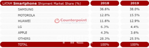 11일 글로벌 시장조사업체 카운터포인트리서치에 따르면 지난해 삼성전자의 남미 스마트폰 시장 점유율은 38.0%로 집계됐다. 이는 2위인 모토로라의 15.5% 점유율 2배가 넘는 격차다.