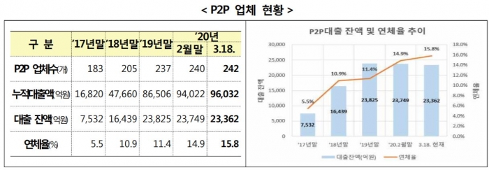 P2P 업체는 242곳, 대출잔액은 2조3362억원이다.
