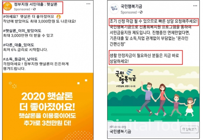 금감원은 불법 대출업자들이 주로 페이스북에 서민금융통합지원센터의 햇살론, 국민행복기금과 유사한 명칭 및 로고를 사용해 광고하는 등 정부의 서민지원대출을 사칭하고 있다고 지적했다.