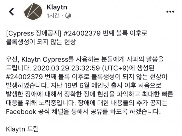그라운드X는 30일 공식 페이스북을 통해 "29일 오후 11시 32분 생성된 24002379번째 블록 이후 블록생성이 되지 않는 현상이 발생했다"며 "지난해 6월 사이프레스 출시 이후 처음 발생한 장애에 대해 정확한 현상을 파악하고 최대한 빠른 대응을 위해 노력 중"이라고 밝혔다.
