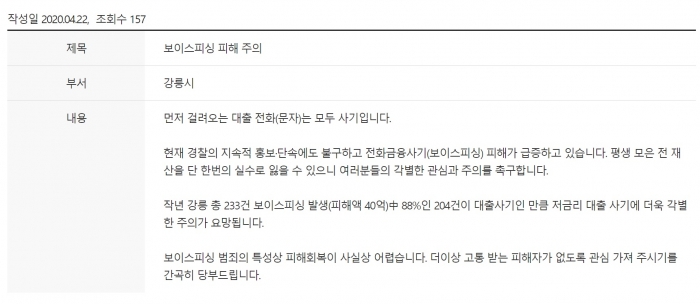 또 강릉시는 4월 22일 공지를 통해 최근 보이스피싱 등으로 인한 피해가 급증하고 있다며 시민들의 관심과 주의를 당부했다.