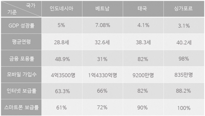 26일 삼정KPMG 경제연구원이 금융위원회에 제출한 '2019 아세안 주요국 핀테크 산업 동향 조사' 연구용역 보고서에 따르면 우리나라 핀테크기업이 우선적으로 진출해야 할 아세안 국가로 인도네시아·베트남·태국·싱가포르 등 4개국이 지목됐다.