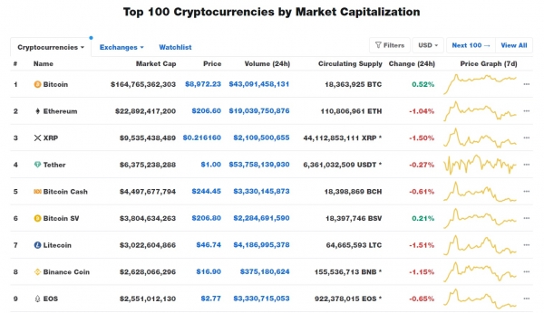 6일 가상자산(암호화폐) 정보 사이트 코인마켓캡에서 비트코인(BTC)은 전날 대비 0.5% 오른 8970달러(약 1095만원) 대에서 가격이 형성됐다.