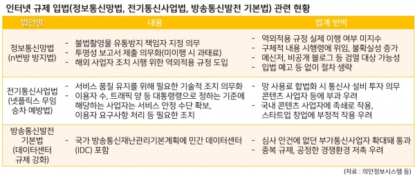 지난 7일 국회 과방위 전체회의에서는 인터넷 산업 규제 법안이라고 할 수 있는 ▲전기통신사업법(일명 ‘넷플릭스 무임승차 예방법’) ▲정보통신망 이용촉진 및 정보보호 등에 관한 법률(일명 ‘n번방 방지법’) ▲방송통신발전 기본법(데이터센터(IDC) 규제 강화 골자) 각 일부개정법률안과 시행령이 통과됐다.